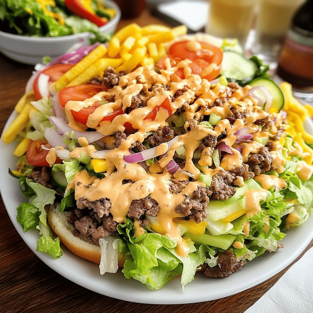 - Juicy, Seasoned Beef: This salad features perfectly seasoned ground beef, cooked to perfection to give you that burger taste without the bun.