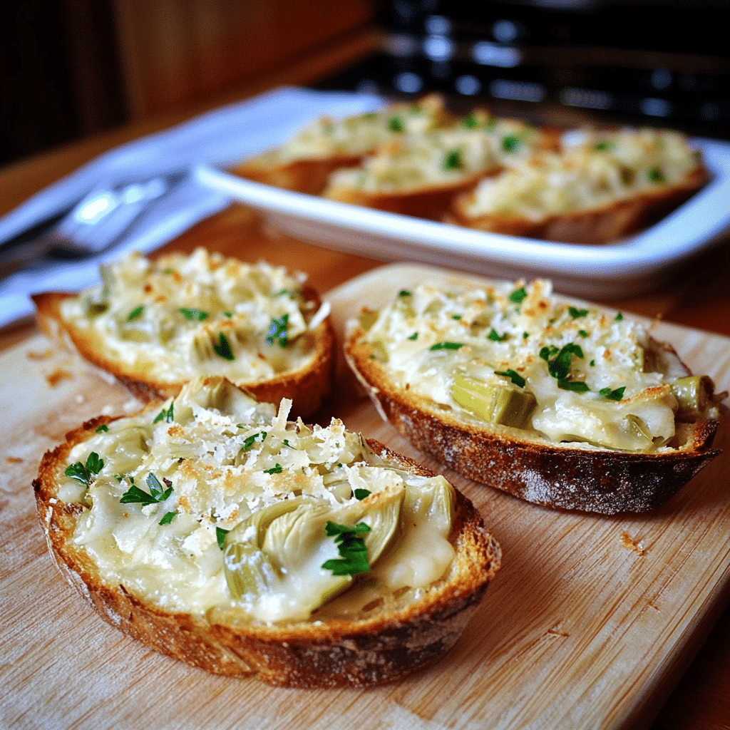 - Top with Artichoke Mixture: Once the bread is toasted, remove it from the oven. Spoon a generous amount of the cheesy artichoke mixture onto each slice of bread, spreading it out evenly.
