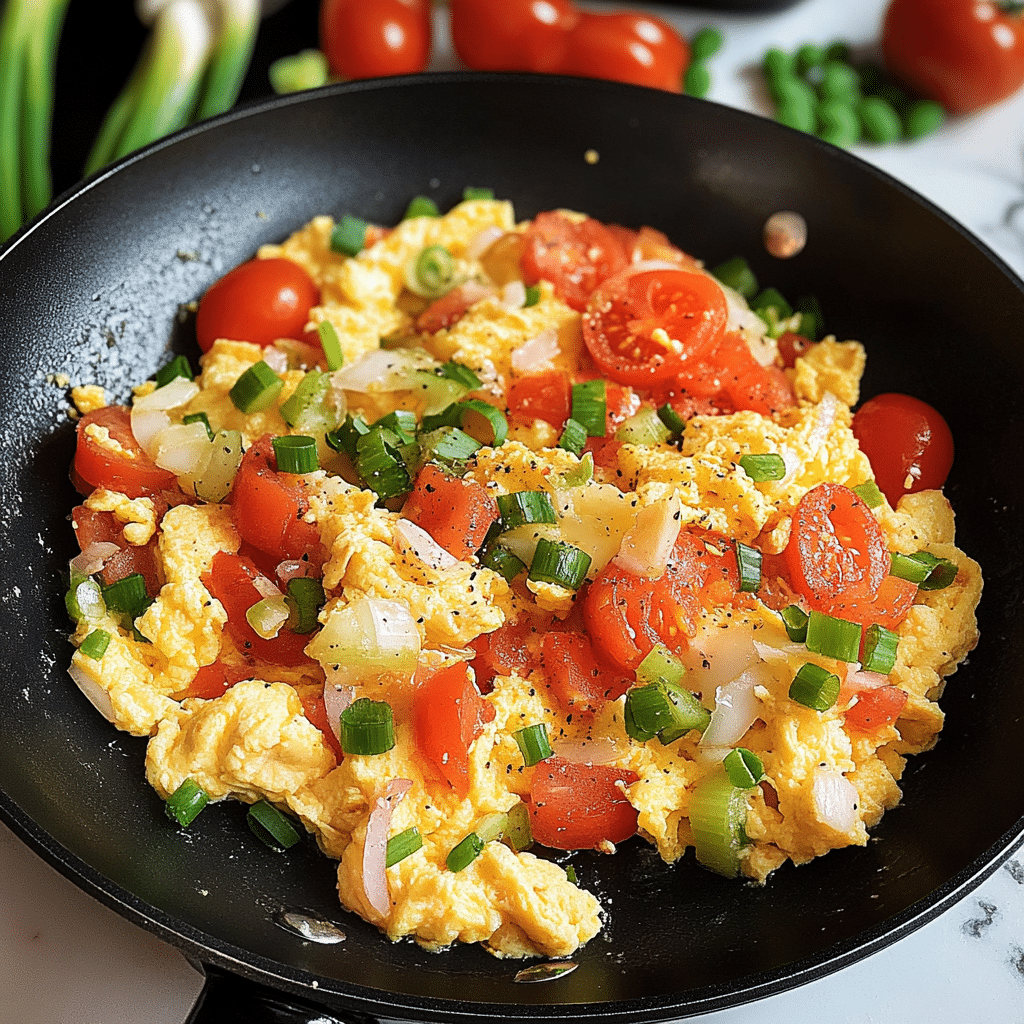 Scrambled Eggs with Onions and Tomatoes is a delightful, savory dish that combines the creaminess of scrambled eggs with the sweetness of caramelized onions and the fresh burst of ripe tomatoes. This dish is incredibly versatile, making it perfect for breakfast, brunch, or even a quick and satisfying dinner. The combination of ingredients brings out a harmonious balance of flavors, while still being simple and easy to prepare. With the warm, rich texture of scrambled eggs and the aromatic flavor of sautéed onions and juicy tomatoes, this dish will quickly become a favorite in your household. Whether you’re looking for a quick meal or something to impress your guests, Scrambled Eggs with Onions and Tomatoes is sure to be a hit.