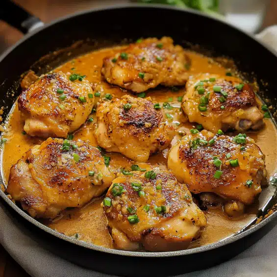 Transfer the coated chicken thighs to a serving platter and garnish with freshly chopped parsley. The vibrant green parsley adds a lovely pop of color and freshness that balances out the richness of the sauce.